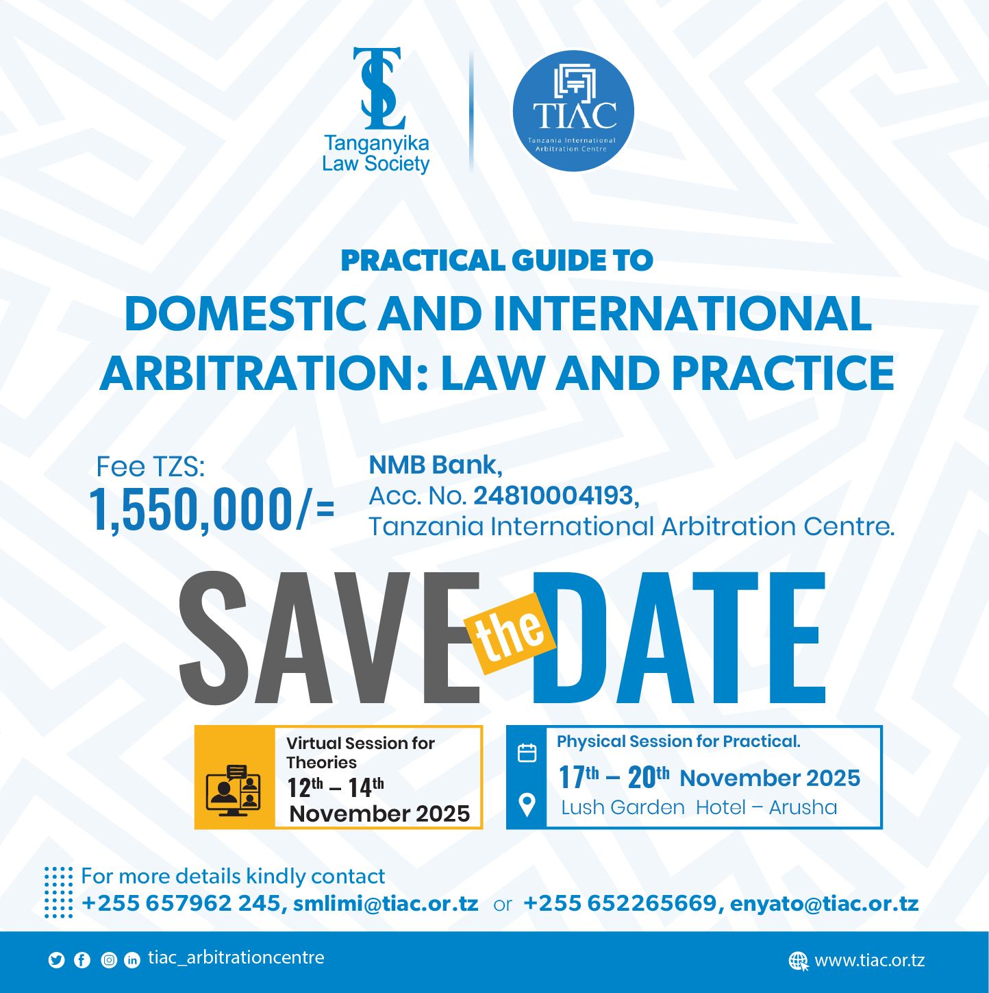 We are pleased to inform you that, TIAC is organizing a physical training program titled “Practical Guide to Domestic and International Arbitration: Law and Practice”. The program will be delivered in two phases: theoretical sessions online from 12th to 14th November 2025, followed by practical sessions physically from 17th to 20th November 2025 at Lush Garden Hotel, Arusha.